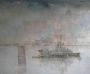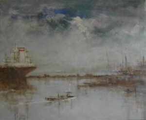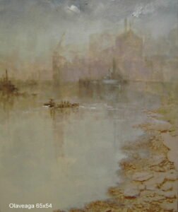 El muelle, las casas, alguna embarcación dormida sobre el agua que no inquieta la brisa, han sido sorprendidos bajo la luz del alba o de la atardecida, claridad empañada por una leve bruma cálida. Nada hay en la pintura de Luzuriaga que suponga contraste cromático. Sus paisajes aspiran a ser un sueño de blanco dorado, luz irreal, zumbido del silencio. Los esquemas compositivos de rigurosa construcción, pierden a sus artistas al quedar sumergidas en la claridad. Es una visión soñadora y lírica, como algo a punto de desvanecerse, un arte de mesura y equilibrio que aspira a la expresión más sencilla, pero sin renegar de los necesarios -apenas perceptibles en una primera ojeada- refinamientos.